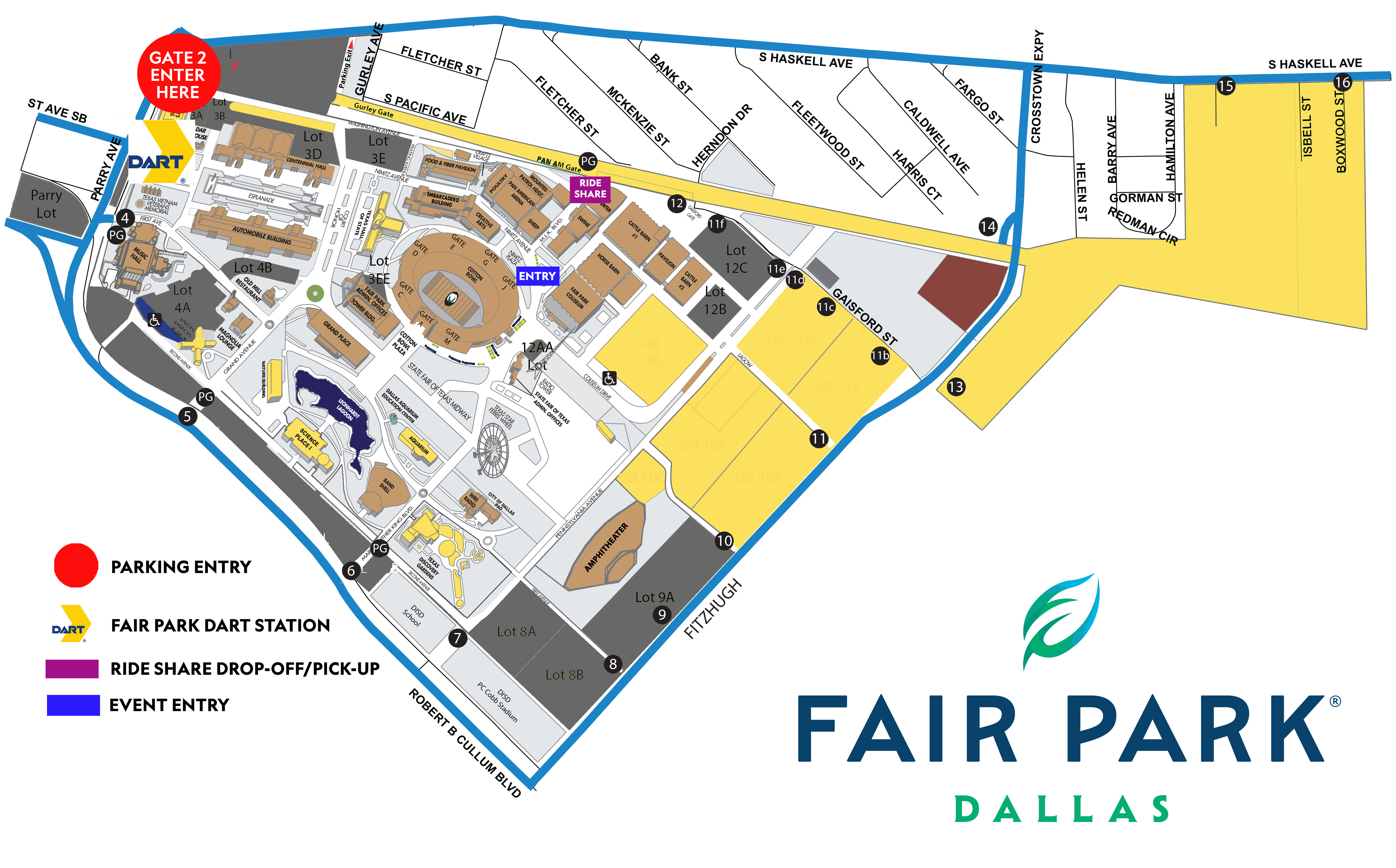 · Fair Park visitors can ride the DART Rail Green Line to two stations – Fair Park Station, located on Parry Avenue at the entrance to the fairgrounds, and MLK, Jr. Station, located south of Robert B. Cullum Blvd. and convenient to the MLK fairground entrance (Gate 6). Visit https://www.dart.org/ for more information.